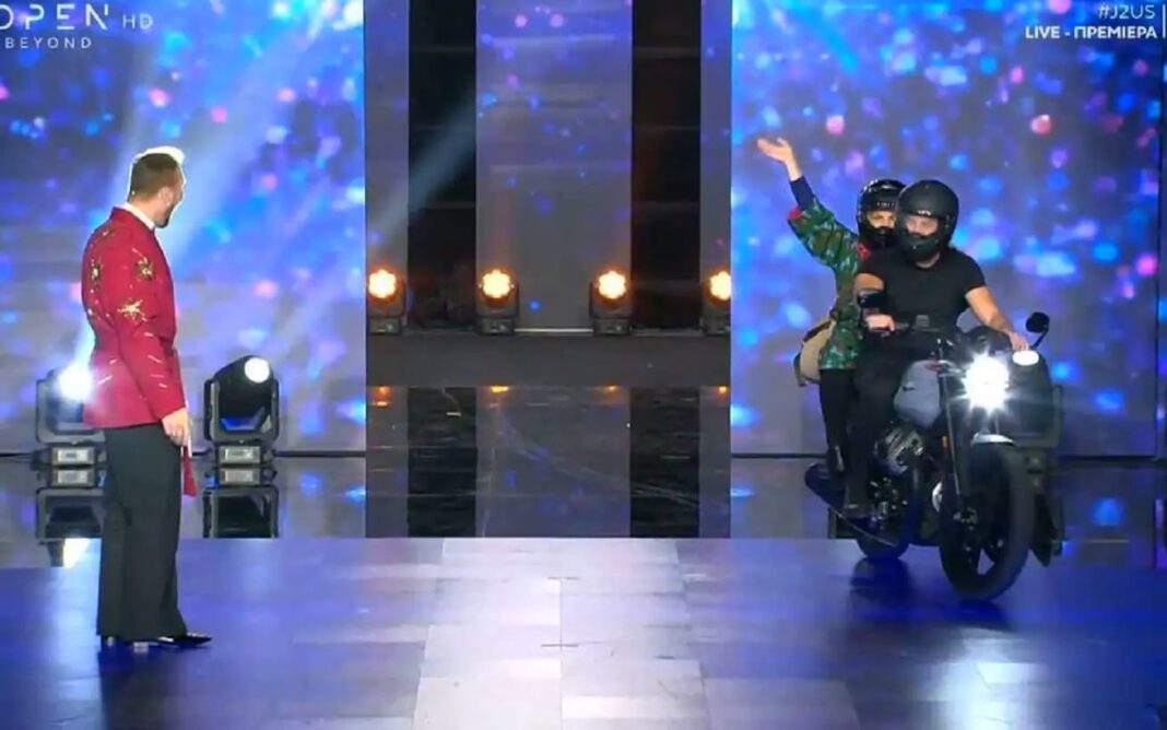 Μάλιστα επέλεξαν να εμφανιστούν εισερχόμενοι με τη στρογγυλοφάναρη μηχανή του «Σωτήρη», του «σκληρού» αντρικού ρόλου που υποδυόταν ο Αλέξης Γεωργούλης, ξαναπαίζοντας έτσι μια χαρακτηριστική σκηνή από τη σειρά.