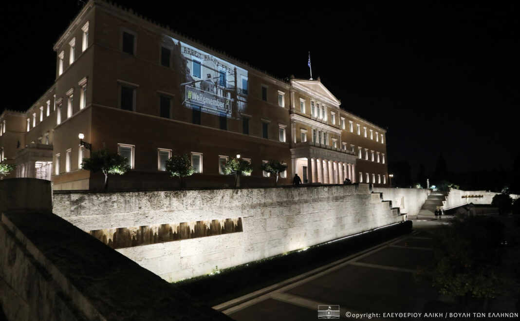 Με το σύνθημα #WE REMEMBER, της Διεθνούς Εκστρατείας για τη Μνήμη του Ολοκαυτώματος, φωταγωγήθηκε σήμερα (26/1) η πρόσοψη του Μεγάρου της Βουλής των Ελλήνων.