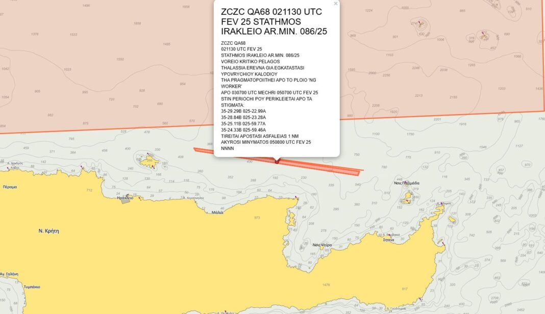 Δύο ερευνητικά πλοία, τα ‘NG WORKER’ και ‘IEVOLI RELUME’ με δύο NAVTEX βγήκαν στα 7 ναυτικά μίλια βόρεια του Λασιθίου για τις έρευνες πόντισης του καλωδίου ηλεκτρικής σύνδεσης της Ελλάδας με την Κύπρο και το Ισραήλ.