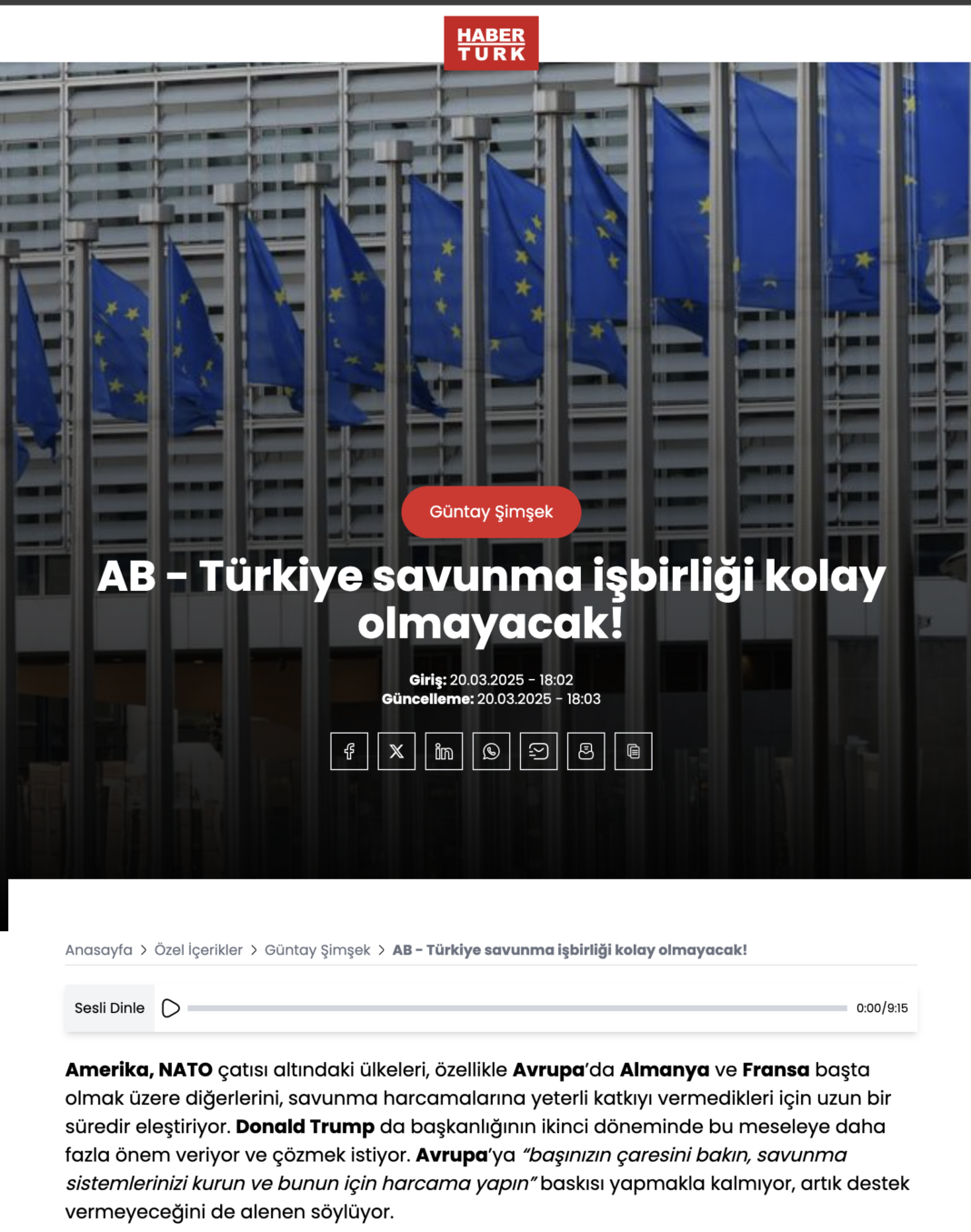Με τίτλο «Η αμυντική συνεργασία ΕΕ – Τουρκίας δεν θα είναι εύκολη!» δημοσιεύεται στην ιστοσελίδα φιλοκυβερνητικού τηλεοπτικού σταθμού Habertürk άρθρο του Güntay Şimşek, δημοσιογράφου – εξειδικευμένου σε θέματα αεροναυπηγικής και τεχνολογίας, ο οποίος επισημαίνει ότι τις τελευταίες ημέρες, αναφερόταν ότι το Ηνωμένο Βασίλειο και η Τουρκία θα συνεισφέρουν στην αμυντική βιομηχανία της ΕΕ και ότι θα αναπτυχθούν κοινές αμυντικές στρατηγικές και έργα.
