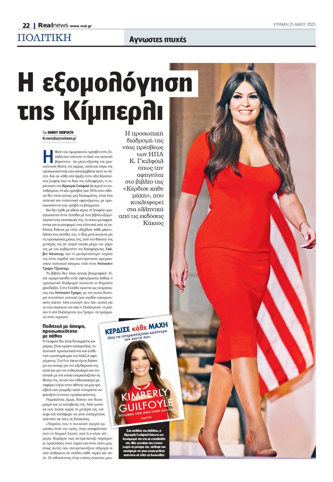 Η Κίμπερλι Γκιλφόιλ, νέα πρέσβης των ΗΠΑ στην Ελλάδα, φέρνει μαζί της το βιβλίο της «Κέρδισε κάθε μάχη», όπου αποκαλύπτει άγνωστες πτυχές της ζωής της, από τις προσωπικές της μάχες μέχρι τις πολιτικές της φιλοδοξίες. Ως πρώην εισαγγελέας και τηλεοπτική προσωπικότητα, η Γκιλφόιλ ενσωματώνει τη δυναμική του τραμπισμού, ενώ η παρουσία της στην Αθήνα αναδεικνύει τη γεωπολιτική σημασία της χώρας.