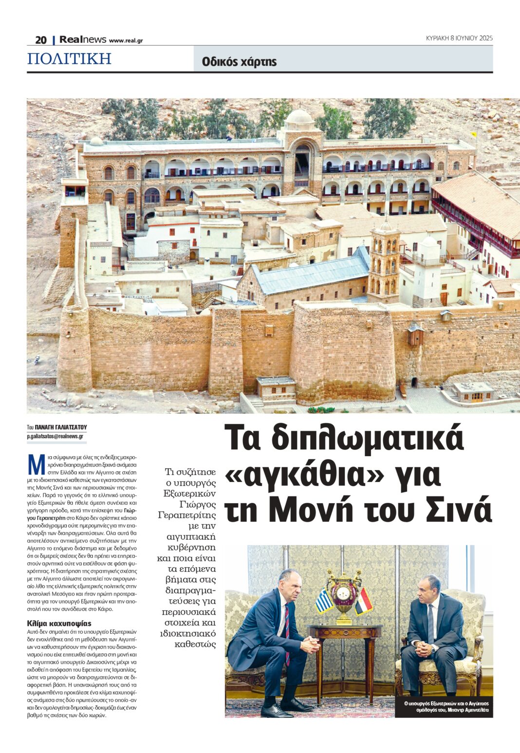 Mια σύμφωνα με όλες τις ενδείξεις μακροχρόνια διαπραγμάτευση ξεκινά ανάμεσα στην Ελλάδα και την Αίγυπτο σε σχέση με το ιδιοκτησιακό καθεστώς των εγκαταστάσεων της Μονής Σινά και των περιουσιακών της στοιχείων. Παρά το γεγονός ότι το ελληνικό υπουργείο Εξωτερικών θα ήθελε άμεση συνέχεια και γρήγορη πρόοδο, κατά την επίσκεψη του Γιώργου Γεραπετρίτη στο Κάιρο δεν ορίστηκε κάποιο χρονοδιάγραμμα ούτε ημερομηνίες για την επανέναρξη των διαπραγματεύσεων.