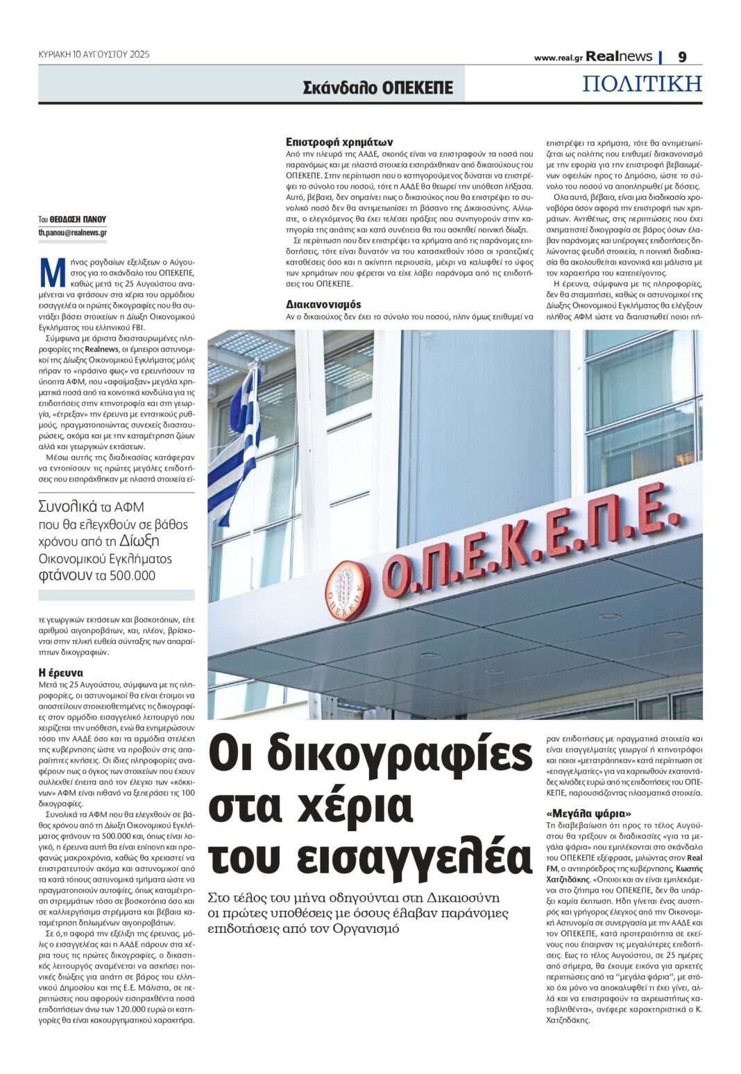 Μήνας ραγδαίων εξελίξεων ο Αύγουστος για το σκάνδαλο του ΟΠΕΚΕΠΕ, καθώς μετά τις 25 Αυγούστου αναμένεται να φτάσουν στα χέρια του αρμόδιου εισαγγελέα οι πρώτες δικογραφίες που θα συντάξει βάσει στοιχείων η Δίωξη Οικονομικού Εγκλήματος του ελληνικού FBI. Σύμφωνα με άριστα διασταυρωμένες πληροφορίες της Realnews, οι έμπειροι αστυνομικοί της Δίωξης Οικονομικού Εγκλήματος μόλις πήραν το «πράσινο φως» να ερευνήσουν τα ύποπτα ΑΦΜ, που «αφαίμαξαν» μεγάλα χρηματικά ποσά από τα κοινοτικά κονδύλια για τις επιδοτήσεις στην κτηνοτροφία και στη γεωργία, «έτρεξαν» την έρευνα με εντατικούς ρυθμούς, πραγματοποιώντας συνεχείς διασταυρώσεις, ακόμα και με την καταμέτρηση ζώων αλλά και γεωργικών εκτάσεων.
