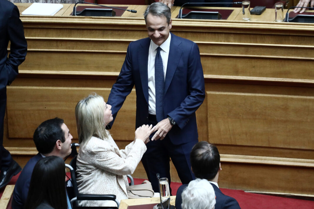 Ο Πρωθυπουργός, Κυριάκος Μητσοτάκης μπαίνοντας στην αίθουσα της Βουλής, είχε έναν σύντομο διάλογο και χειραψία με την Ζέττα Μακρή.