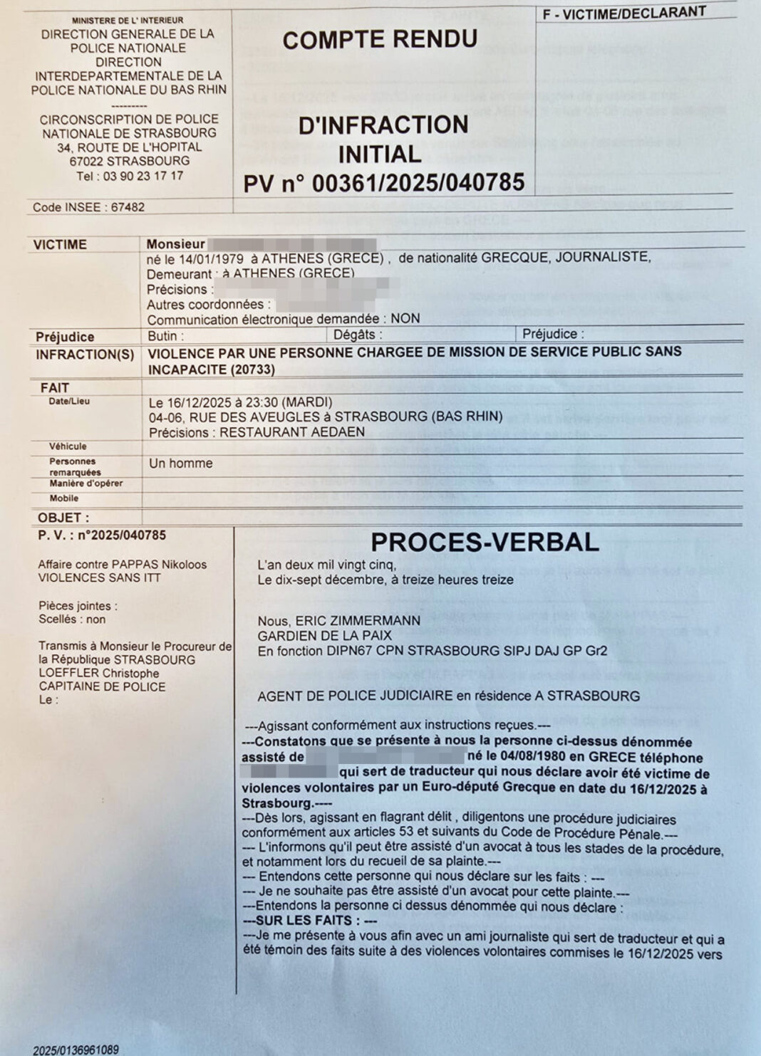 Την Τετάρτη 17 Δεκεμβρίου, ο Νίκος Γιαννόπουλος υπέβαλε μήνυση στην Αστυνομική Διοίκηση Αλσατίας, που εδρεύει στο Στρασβούργο, και περιέγραψε αναλυτικά το περιστατικό στον αστυνομικό, που του πήρε κατάθεση. Ο ευρωβουλευτής κατηγορείται για άσκηση βίας από εκπρόσωπο σε θεσμικό ρόλο σε ήρεμη ψυχική κατάσταση. Έως το βράδυ της Τετάρτης ο Νίκος Παππάς αναζητείται στο πλαίσιο του αυτοφώρου, κάτι που δεν καλύπτεται από την ασυλία του.