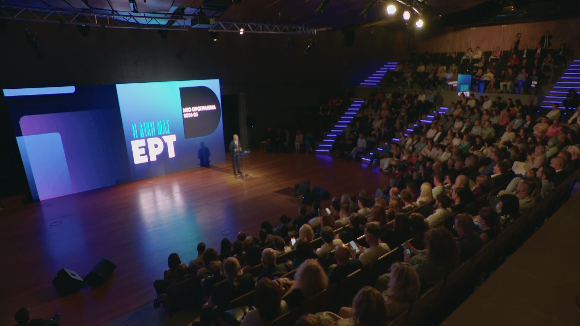 Βλέπετε ένα μήνυμα εδώ: «Η δική μας ΕΡΤ». Και θα ήθελα να σταθώ σε αυτό το μήνυμα. Τι σημαίνει η δίκη μας ΕΡΤ; Όταν είχαμε βρεθεί την τελευταία φορά με κάποιους από εσάς που παρουσιάζαμε το καλοκαιρινό πρόγραμμα, γνωρίζαμε ότι θα είναι ένα πλούσιο τηλεοπτικό πρόγραμμα, ήταν τότε λίγο πριν την Eurovision, μεσολάβησε το Euro 2024, ακολούθησε το συγκλονιστικό Προολυμπιακό τουρνουά και προχωρήσαμε στους Ολυμπιακούς Αγώνες και τους Παραολυμπιακούς Αγώνες με πολλή συγκίνηση, πολλά μετάλλια και 900 ώρες τουλάχιστον τηλεοπτικές μεταδόσης. Ήταν πραγματικά γεμάτοι δράση αυτοί οι μήνες. Και σε αυτούς τους μήνες, είχαμε απλά πραγματικά την ευκαιρία να δώσουμε τον καλύτερο εαυτό μας.