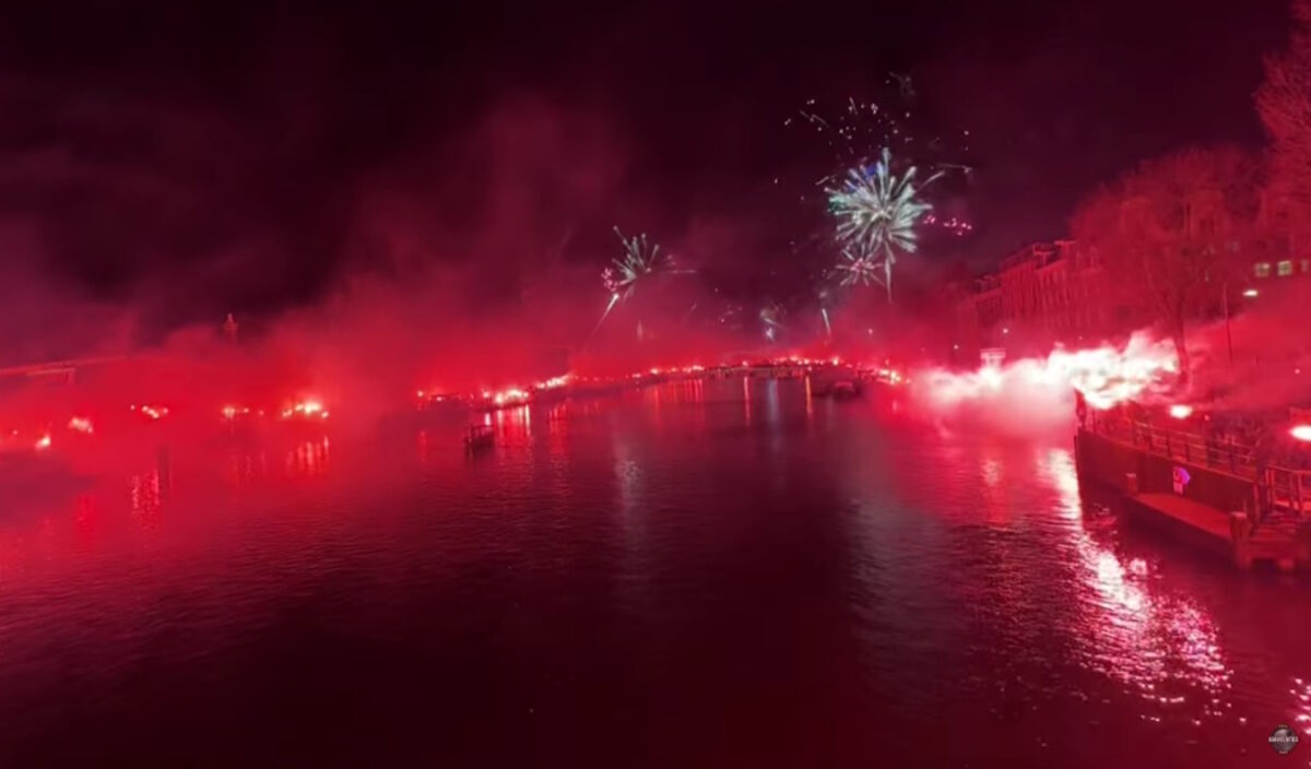 Όταν το φως του ηλίου χάθηκε, οι φίλοι του Άγιαξ δημιούργησαν μια εντυπωσιακή εικόνα με το pyroshow που ξεκίνησαν, κάνοντας… τη νύχτα – μέρα κατά μήκος των καναλιών της πόλης και τραγουδώντας διαρκώς συνθήματα για την αγαπημένη τους ομάδα!