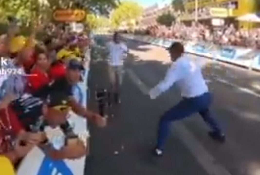 Ένας διαδηλωτής, ο οποίος υποστηρίζει την Παλαιστίνη, επιχείρησε να μπουκάρει στον Ποδηλατικό Γύρο της Γαλλίας, ωστόσο ένας μέλος του προσωπικού ασφαλείας τον απομάκρυνε με βίαιο τρόπο.