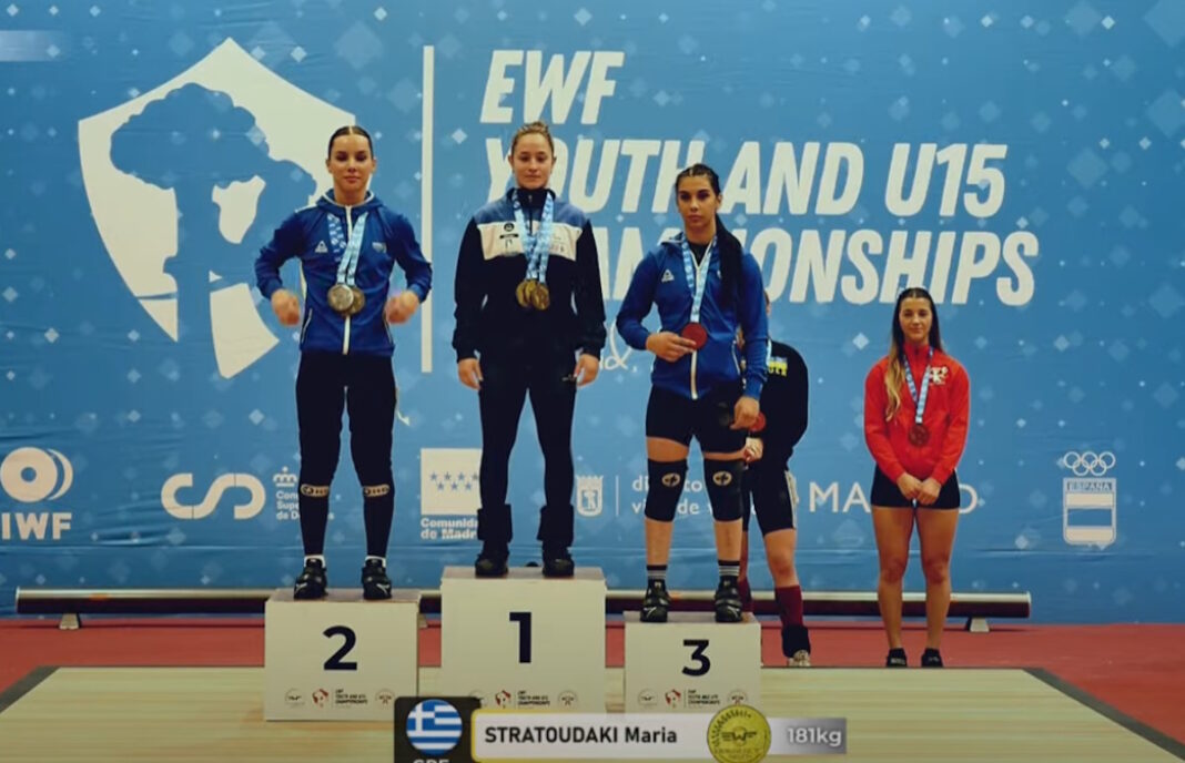 Η 17χρονη Μαρία Στρατουδάκη από τα Χανιά κατέκτησε τρία χρυσά μετάλλια στο Ευρωπαϊκό Πρωτάθλημα Άρσης Βαρών Νέων-Νεανίδων στη Μαδρίτη, σημειώνοντας ισάριθμα ρεκόρ Ευρώπης στην κατηγορία των 53 κιλών. Η Στρατουδάκη εντυπωσίασε με τις επιδόσεις της στο αρασέ και το επολέ ζετέ, σηκώνοντας συνολικά 181 κιλά, και άφησε πίσω της τη Ρουμάνα Σίπος. Η επιτυχία της προκάλεσε συγκίνηση και υπερηφάνεια στην ελληνική αποστολή, με την Πρόεδρο της Ελληνικής Ομοσπονδίας Άρσης Βαρών, Θεανώ Ζαγκλιβέρη, να εκφράζει τα συγχαρητήριά της στη νεαρή πρωταθλήτρια και την ομάδα της.