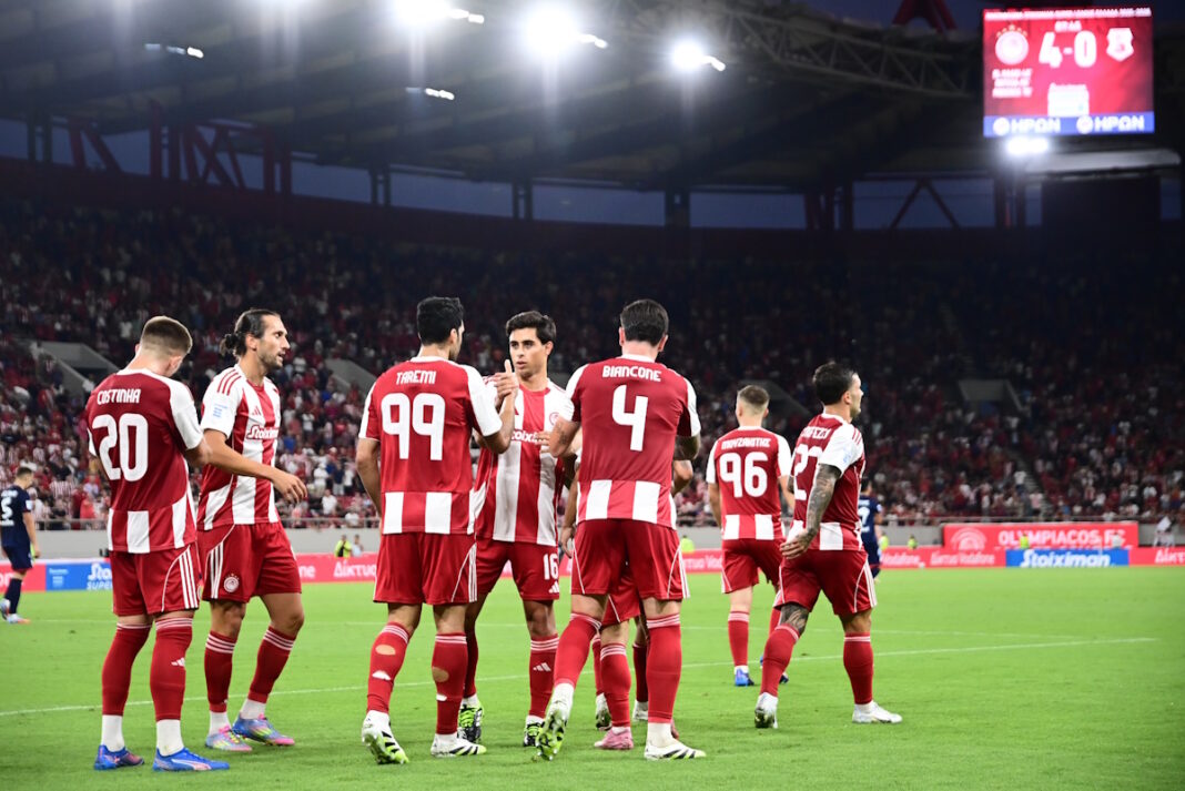 Ο Ολυμπιακός ετοιμάζεται να υποδεχθεί την Πάφο στο κατάμεστο "Γ. Καραϊσκάκης" για την πρεμιέρα του Champions League, φορώντας την κλασική ερυθρόλευκη φανέλα.