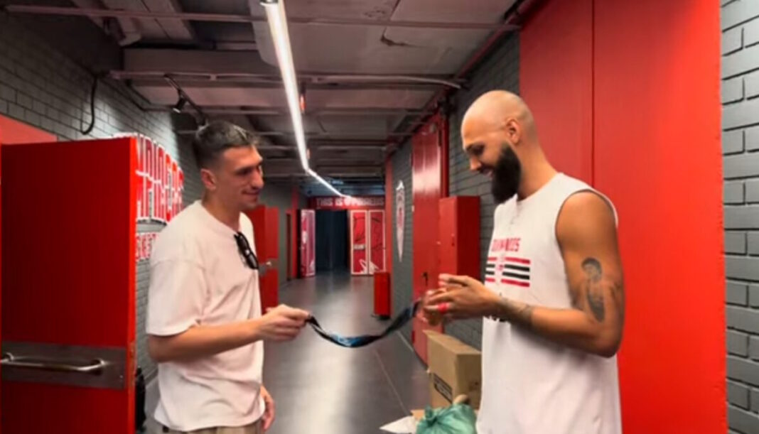 Ο Γιαννούλης Λαρεντζάκης ήταν πάντως αυτός που έκλεψε την παράσταση στα αποδυτήρια του ΣΕΦ, δείχνοντας με υπερηφάνεια το μετάλλιο που κατέκτησε με την Εθνική Ελλάδας στο Eurobasket.