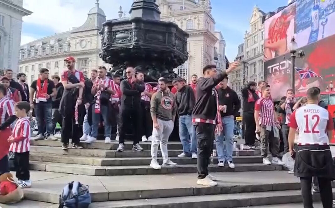 Δεκάδες φίλοι του Ολυμπιακού συγκεντρώθηκαν από νωρίς σε ένα από τα πιο κεντρικά σημεία του Λονδίνου, στο Piccadilly Circus, προκειμένου από εκεί να μεταβούν όλοι μαζί στο γήπεδο της Άρσεναλ.