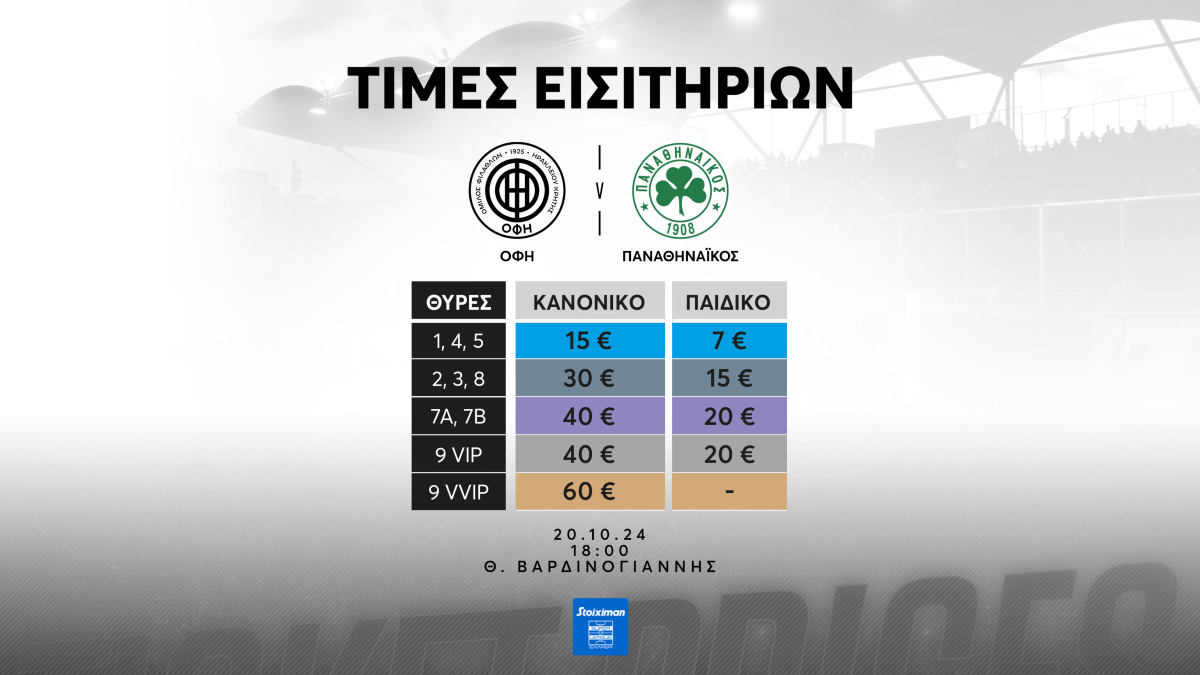 - Οι τιμές των εισιτηρίων, η διαδικασία αγοράς και οι πληροφορίες για την Κάρτα Φίλου ΟΦΗ αναφέρονται αναλυτικά.