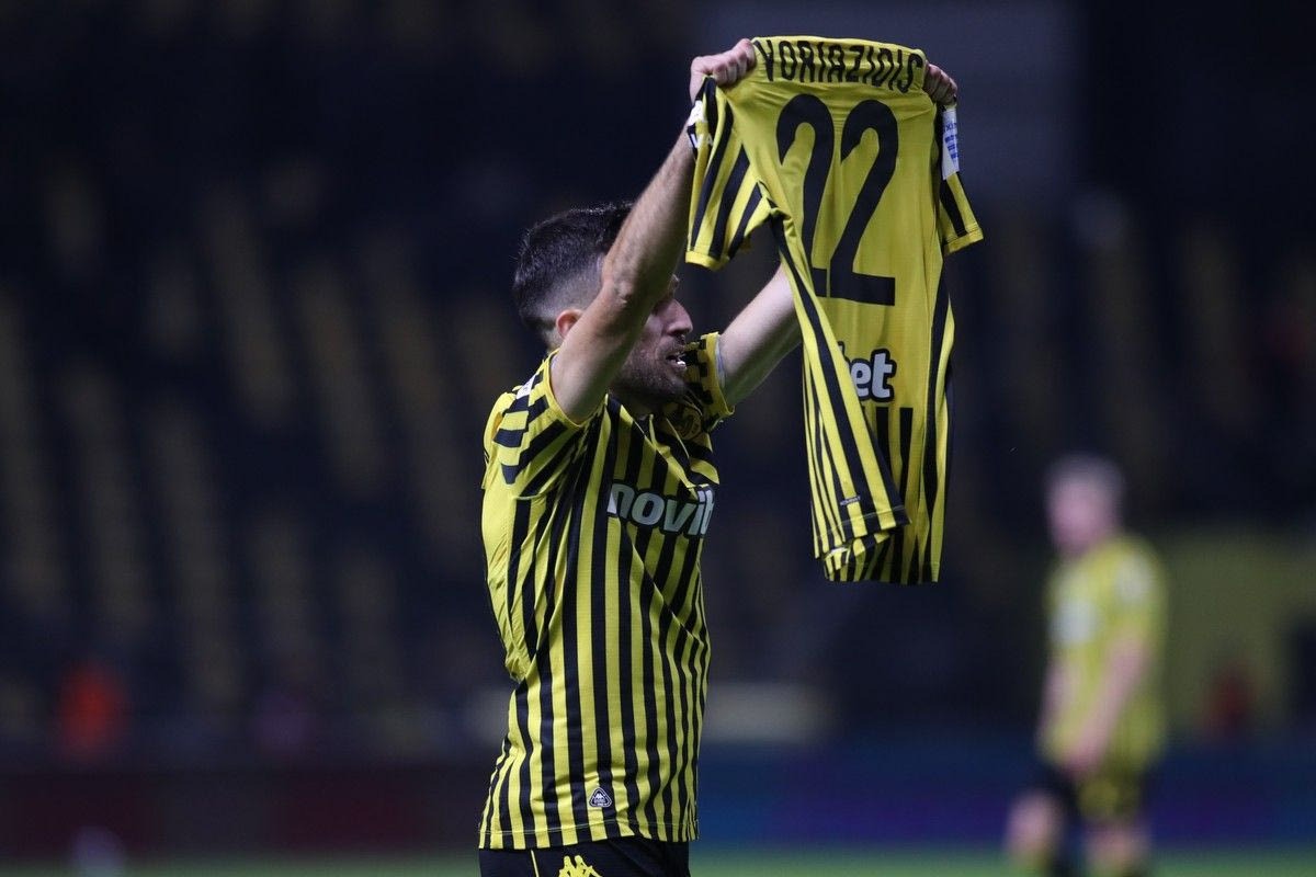 Οι ποδοσφαιριστές του Άρη αφιέρωσαν το γκολ της ισοφάρισης κόντρα στον Παναθηναϊκό στον συμπαίκτη τους Μιχάλη Βοριαζίδη.