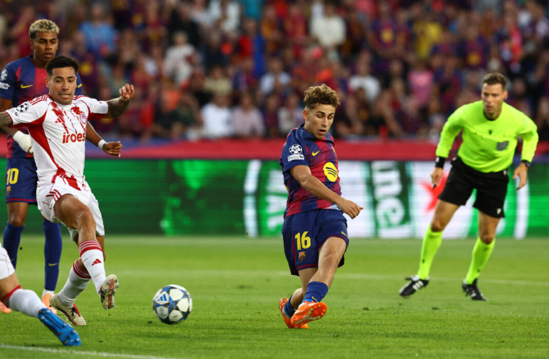 Σε ταχύτατη αντεπίθεση των Καταλανών, ο Τζολάκης σταμάτησε αρχικά τον Γιαμάλ αλλά η μπάλα έφτασε στον Ισπανό, που κατάφερε να σκοράρει παρότι υπήρχαν αμυντικοί του Ολυμπιακού μπροστά του.