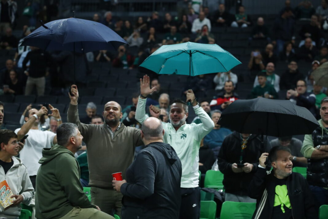Ένα 24ωρο μετά την αναβολή του Ολυμπιακός – Φενέρμπαχτσε εξαιτίας της κακοκαιρίας στο ΣΕΦ, ο Παναθηναϊκός υποδέχθηκε χωρίς προβλήματα της Βαλένθια για τη Euroleague και οι οπαδοί του άνοιξαν ομπρέλες στην εξέδρα.