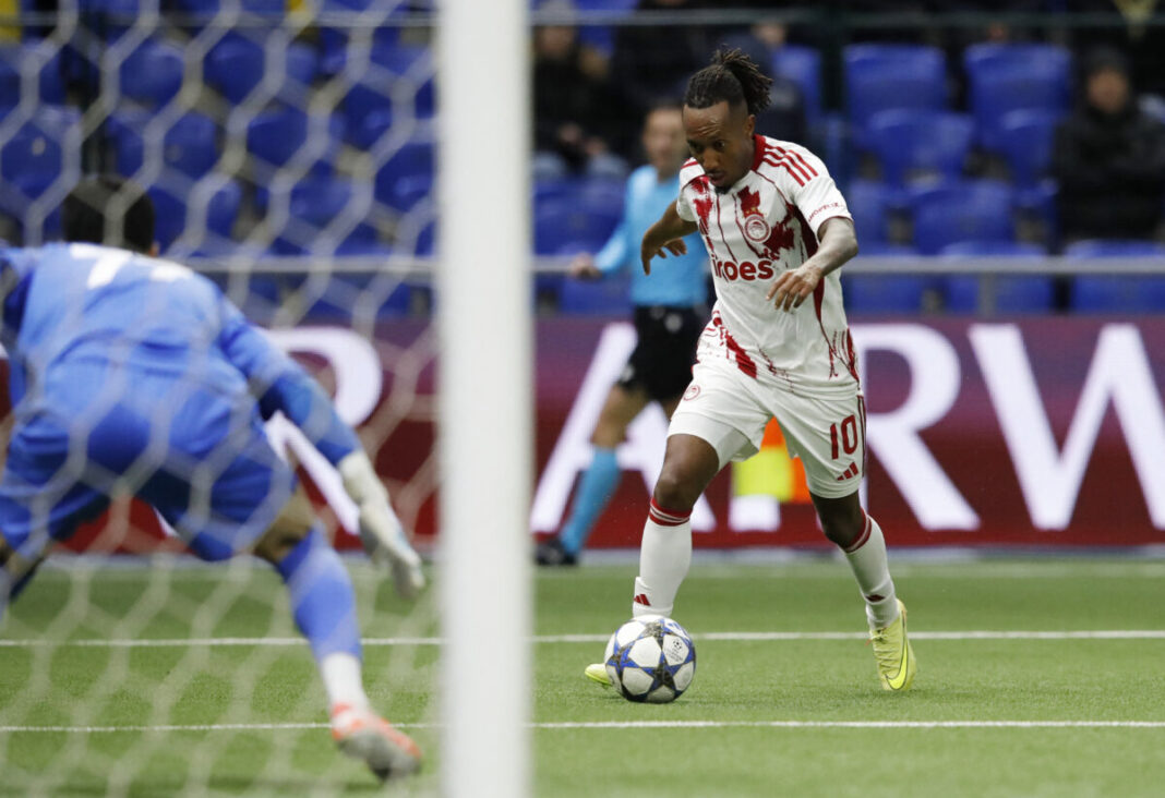 Ο Ζέλσον Μαρτίνς σκοράρει από δύσκολη γωνία, δίνοντας προβάδισμα στον Ολυμπιακό κόντρα στην Καϊράτ Αλμάτι στο Champions League