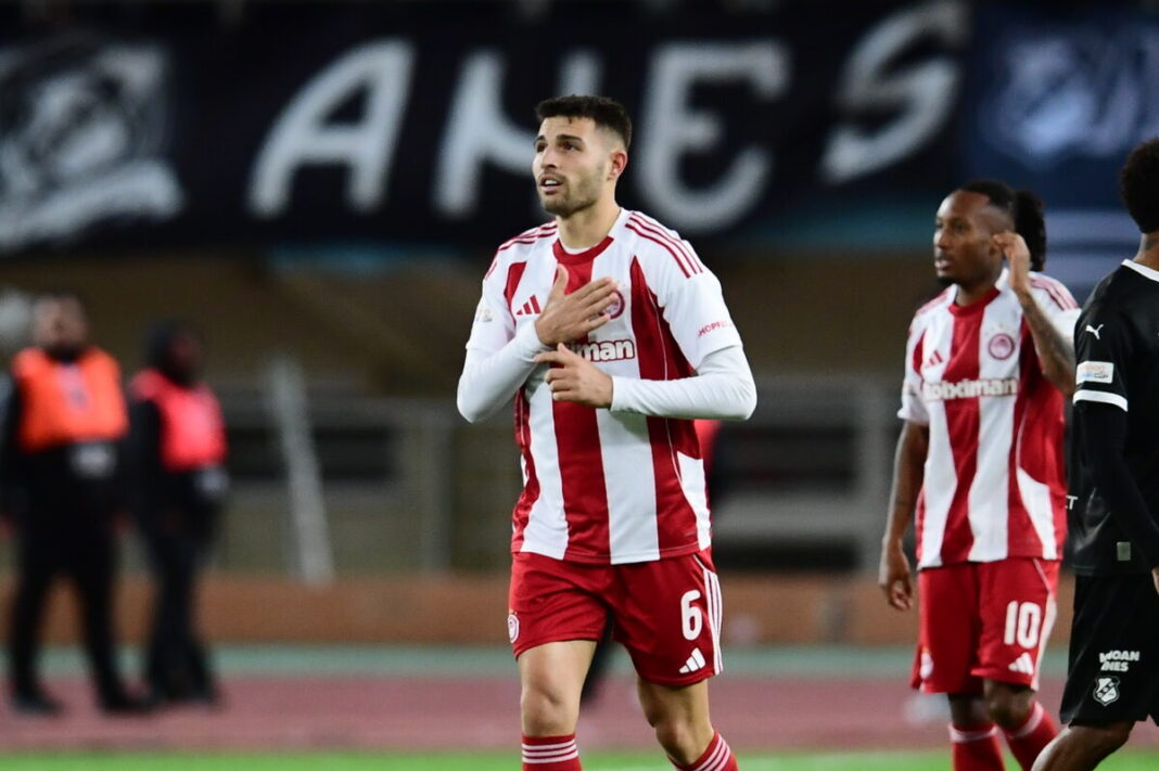 Ο Καλογερόπουλος αφού κέρδισε το πέναλτι που έδωσε την ευκαιρία στον Ταρέμι να κάνει το 1-0 στο Ολυμπιακός – ΟΦΗ, με κεφαλιά έκανε το 2-0.