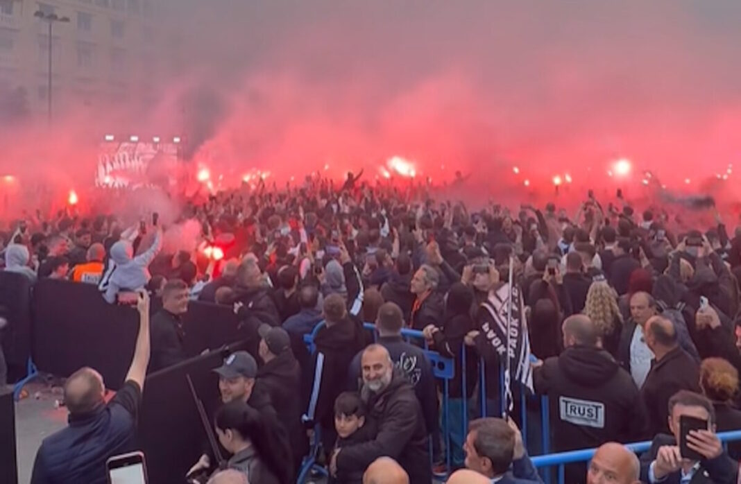 Όταν το ρολόι έδειξε 19:26, δηλαδή τη χρονολογία ίδρυσης του ΠΑΟΚ, οι οπαδοί του “δικεφάλου του Βορρά” έβαλαν… φωτιά στην πλατεία Αριστοτέλους, με δεκάδες καπνογόνα και πυροτεχνήματα να δημιουργούν μαγική ατμόσφαιρα.