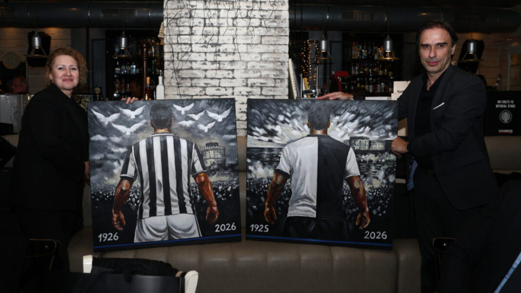 Στην κα Μαρία Γκοντσάρεβα και στον κ. Ηλία Πουρσανίδη προσφέρθηκαν οι εντυπωσιακοί πίνακες που είναι εμπνευσμένοι από τη διαχρονική σχέση των συλλόγων με τους φιλάθλους τους.