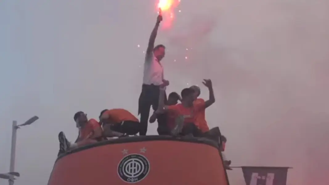 Οι Ομιλίτες έβαλαν… φωτιά στην πόλη με αμέτρητους πυρσούς, για να γιορτάσουν την επιτυχία του ΟΦΗ. Από την πλευρά του και ο Χρήστος Κόντης “έζησε” αυτές τις μοναδικές στιγμές ως… οπαδός, καθώς σηκώθηκε όρθιος στο ανοιχτό πούλμαν των Κυπελλούχων Ελλάδας και άναψε καπνογόνο!