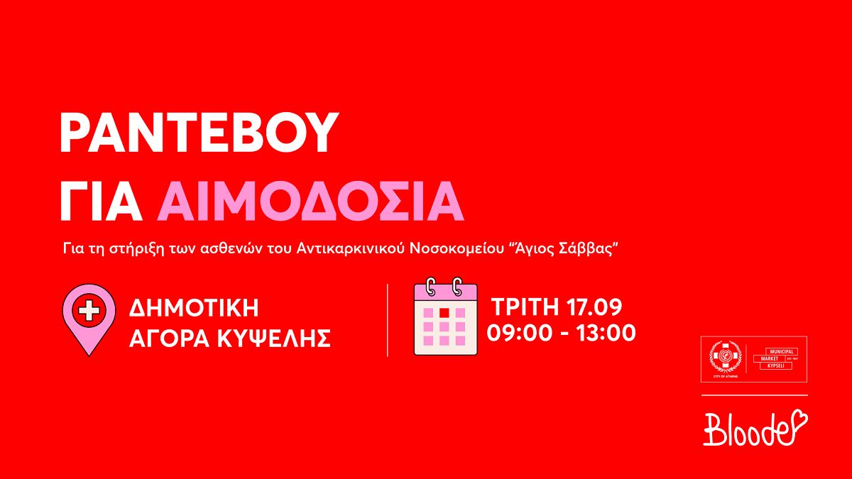 - Η εθελοντική αιμοδοσία πραγματοποιείται στη Δημοτική Αγορά Κυψέλης στις 17 Σεπτεμβρίου για τις ανάγκες του Αντικαρκινικού Νοσοκομείου «Άγιος Σάββας».