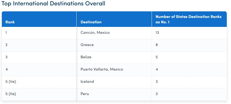 Η Ισλανδία και το Περού κατατάσσονται η καθεμία ως ο δημοφιλέστερος διεθνής προορισμός σε τρεις πολιτείες.