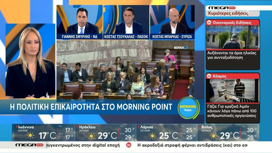 Έντονη αντιπαράθεση σημειώθηκε στο «Morning Point» μεταξύ των βουλευτών Γιάννη Σμυρλή (ΝΔ), Κώστα Τσουκαλά (ΠΑΣΟΚ) και Κώστα Μπάρκα (ΣΥΡΙΖΑ) σχετικά με τις υποθέσεις των Τεμπών και του ΟΠΕΚΕΠΕ. Ο βουλευτής της ΝΔ κατηγόρησε την αντιπολίτευση ότι ενδιαφέρεται μόνο για το θεαθήναι, ενώ υποστήριξε πως η κυβέρνηση παραμένει προσηλωμένη στη διαφάνεια.