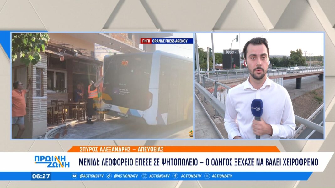 Ασυνήθιστο περιστατικό σημειώθηκε στο Μενίδι όταν ένα λεωφορείο κατέληξε μέσα σε ψητοπωλείο της περιοχής. Το ατύχημα συνέβη λόγω της παράλειψης του οδηγού να ενεργοποιήσει το χειρόφρενο, με αποτέλεσμα το όχημα να κυλήσει ανεξέλεγκτα και να καταλήξει στην πρόσοψη του καταστήματος.