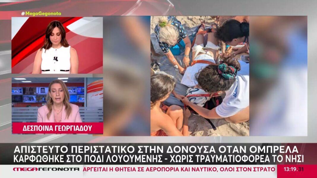 Σοβαρό περιστατικό σημειώθηκε στη Δονούσα όταν μια ομπρέλα παρασύρθηκε από τον άνεμο και καρφώθηκε στο πόδι λουόμενης. Η γυναίκα χρειάστηκε άμεση ιατρική βοήθεια, αλλά η αντιμετώπιση του τραυματισμού καθυστέρησε λόγω έλλειψης βασικών υποδομών στο νησί.