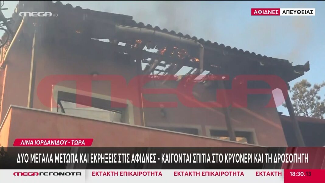 Δραματικές εικόνες καταστροφής στις Αφίδνες, καθώς η πύρινη λαίλαπα συνεχίζει το καταστροφικό της έργο. Οι φλόγες έχουν τυλίξει πολλές κατοικίες της περιοχής, με τις στέγες να υποχωρούν υπό το βάρος της θερμότητας και των καιόμενων υλικών.