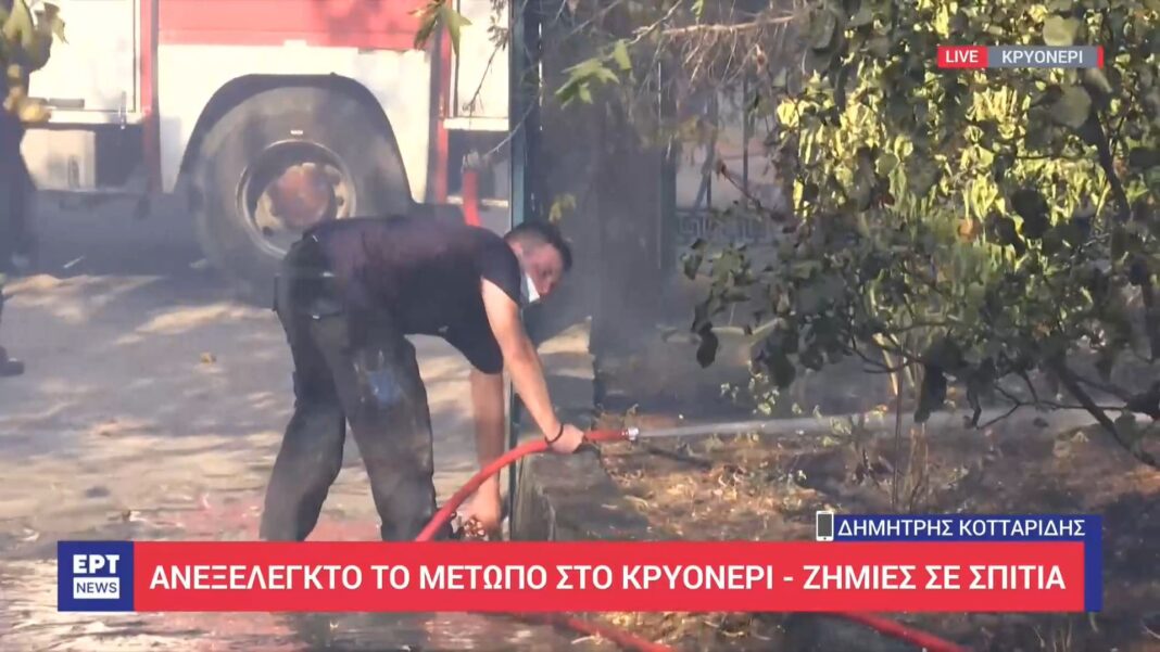 Η πυρκαγιά που μαίνεται στο Κρυονέρι έχει προκαλέσει σημαντικές ζημιές σε κατοικίες της περιοχής. Ο δημοσιογράφος του ΕΡΤNews Δημήτρης Κοττατίδης μεταδίδει από το σημείο ότι το μέτωπο παραμένει ανεξέλεγκτο, ενώ οι πυροσβεστικές δυνάμεις δίνουν μάχη με τις φλόγες.
