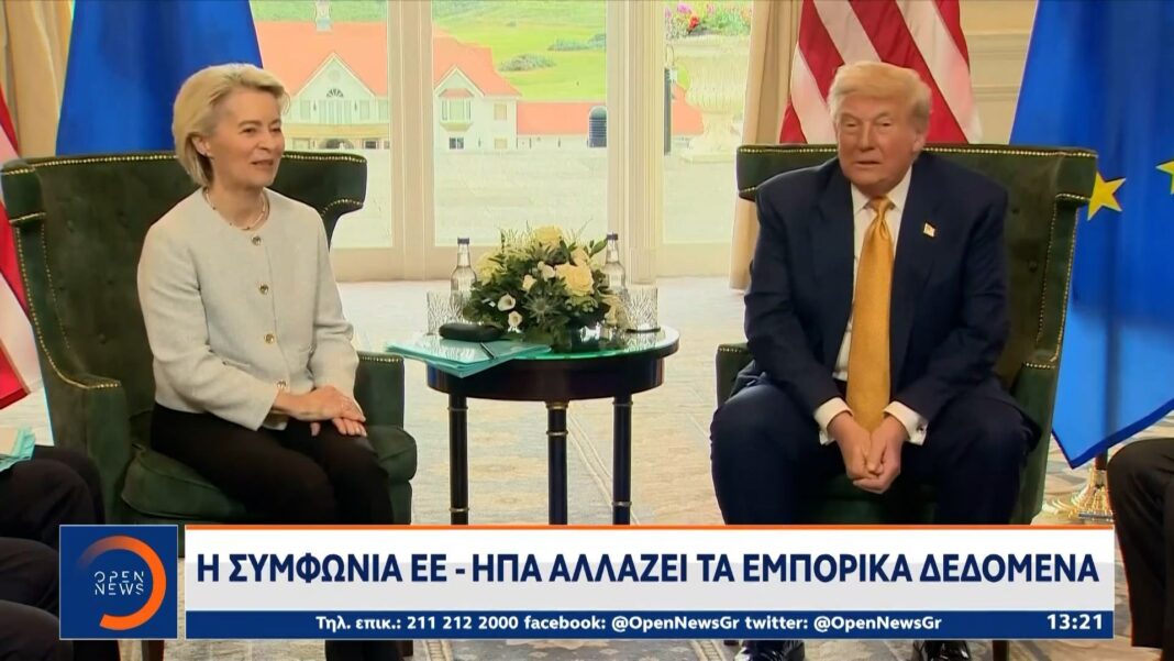 Σημαντική εξέλιξη στις διατλαντικές εμπορικές σχέσεις σηματοδοτεί η συμφωνία μεταξύ ΕΕ και ΗΠΑ για δασμούς στο 15%. Η ανακοίνωση έγινε από τον Αμερικανό πρόεδρο Ντόναλντ Τραμπ και την πρόεδρο της Κομισιόν Ούρσουλα φον ντερ Λάιεν κατά τη συνάντησή τους στη Σκωτία, μειώνοντας στο μισό το αρχικά απειλούμενο ποσοστό.