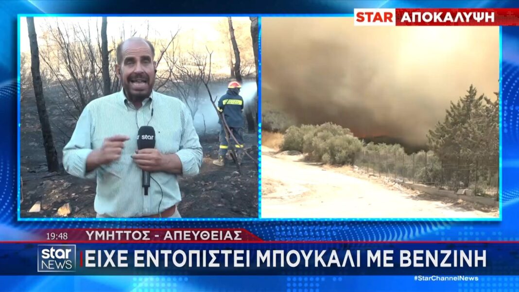 Ισχυρές υποψίες εμπρησμού στον Υμηττό μετά τον εντοπισμό μπουκαλιού βενζίνης στην περιοχή πριν την έναρξη της πυρκαγιάς