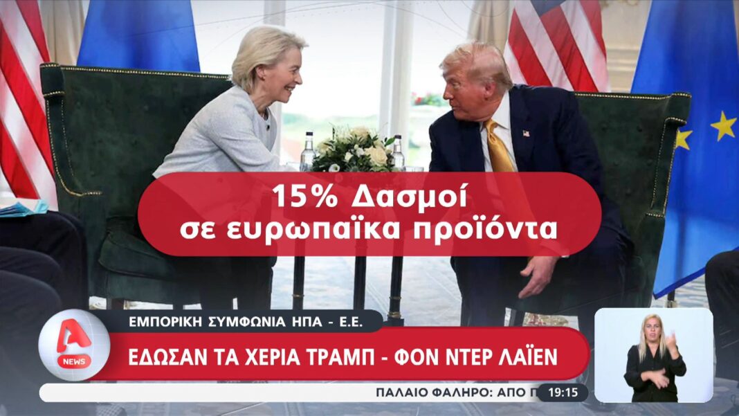 Ο Πρόεδρος των ΗΠΑ Ντόναλντ Τραμπ και η Πρόεδρος της Ευρωπαϊκής Επιτροπής Ούρσουλα φον ντερ Λάιεν συναντήθηκαν στην Ουάσιγκτον για την υπογραφή της νέας εμπορικής συμφωνίας. Η συμφωνία αποτρέπει την κλιμάκωση του εμπορικού πολέμου και προβλέπει μείωση δασμών σε συγκεκριμένα προϊόντα μεταξύ των δύο πλευρών.