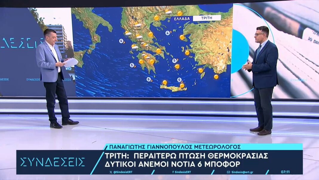 Η σημερινή ημέρα αναμένεται να είναι η πιο δροσερή των τελευταίων δύο εβδομάδων, με αισθητή πτώση της θερμοκρασίας σε ολόκληρη τη χώρα. Σύμφωνα με τον μετεωρολόγο της ΕΡΤ Παναγιώτη Γιαννόπουλο, στα νότια πελάγη οι δυτικοί άνεμοι θα φτάσουν τα 6 μποφόρ, ενώ στην Ήπειρο αναμένονται τοπικές βροχές μέχρι το μεσημέρι.