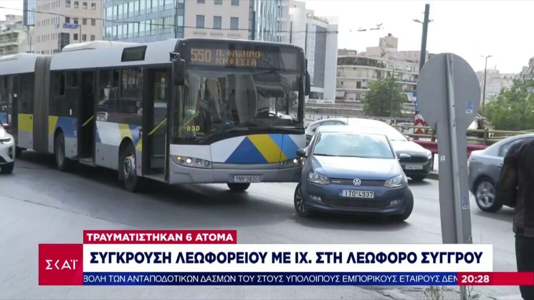 Σοβαρό τροχαίο σημειώθηκε σήμερα το απόγευμα στη λεωφόρο Συγγρού, όταν λεωφορείο της αστικής συγκοινωνίας συγκρούστηκε με ΙΧ αυτοκίνητο. Στο συμβάν τραυματίστηκαν έξι άτομα, εκ των οποίων δύο επιβάτες του λεωφορείου και τέσσερις επιβαίνοντες στο ΙΧ, με έναν εξ αυτών να νοσηλεύεται σε σοβαρή κατάσταση.