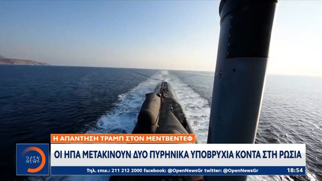 Σε μια κλιμάκωση των στρατιωτικών κινήσεων, ο Ντόναλντ Τραμπ ανακοίνωσε την αποστολή δύο πυρηνικών υποβρυχίων των ΗΠΑ προς τα ρωσικά ύδατα. Η κίνηση αυτή αποτελεί σαφές προειδοποιητικό μήνυμα προς τη Μόσχα, ερχόμενη ως απάντηση στις δηλώσεις του πρώην προέδρου Μεντβέντεφ περί αυξημένου κινδύνου πολέμου μεταξύ των δύο χωρών.
