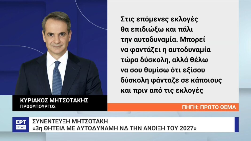 Παράλληλα, ο πρωθυπουργός έθεσε ως βασικό πολιτικό στόχο την τρίτη συνεχόμενη θητεία της Νέας Δημοκρατίας με αυτοδυναμία την άνοιξη του 2027. Σχολίασε επίσης τη στάση της αντιπολίτευσης, υπογραμμίζοντας τις διαφορές στην πολιτική προσέγγιση των κομμάτων σε κρίσιμα εθνικά ζητήματα.