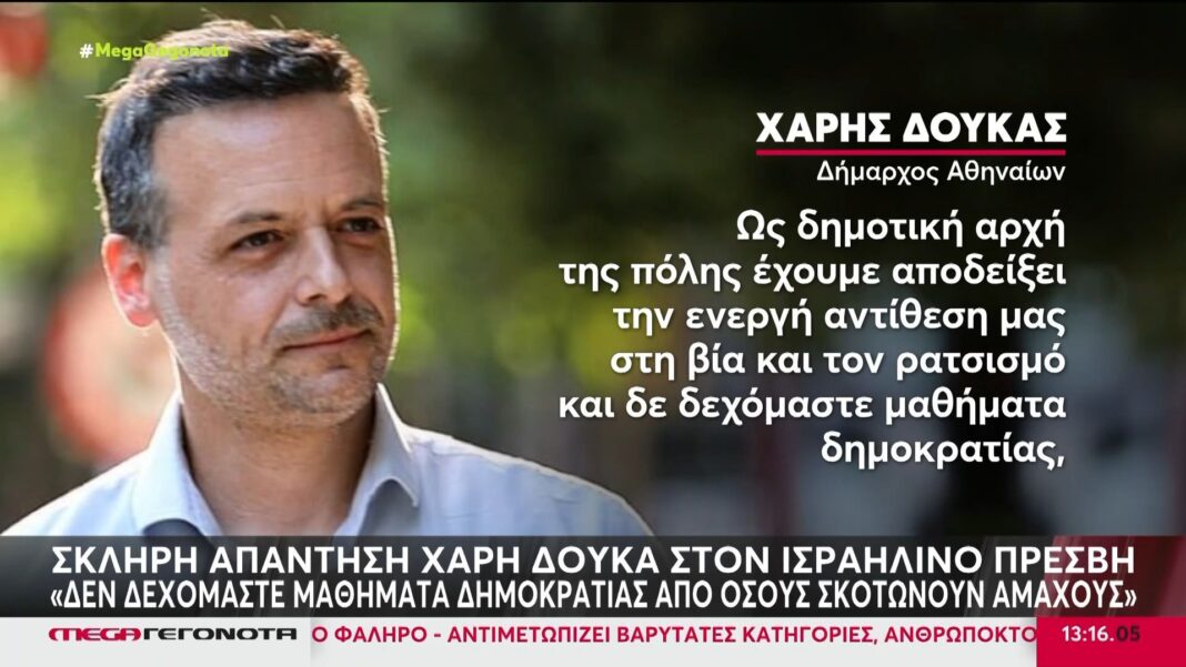 Έντονη αντιπαράθεση ξέσπασε μεταξύ του Δημάρχου Αθηναίων Χάρη Δούκα και του Ισραηλινού πρέσβη κατά τη διάρκεια επίσημης συνάντησης στο Δημαρχείο Αθηναίων. Ο Δούκας απάντησε με αυστηρό τόνο στις παρατηρήσεις του πρέσβη σχετικά με ζητήματα δημοκρατίας, τονίζοντας πως η Ελλάδα δεν δέχεται μαθήματα από χώρες που εμπλέκονται σε επιθέσεις κατά αμάχων.