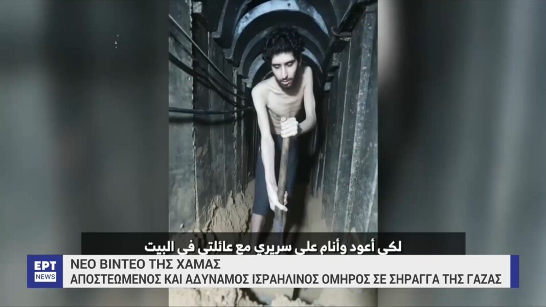 Η Χαμάς δημοσιοποίησε νέο βίντεο που δείχνει τον Εβιατάρ Νταβίντ, έναν αποστεωμένο Ισραηλινό όμηρο, να σκάβει πιθανότατα τον τάφο του σε ένα τούνελ. Ο 24χρονος, που απήχθη στις 7 Οκτωβρίου 2023 από το φεστιβάλ Nova, δηλώνει ότι δεν έχει φάει ούτε πιει νερό για μέρες.