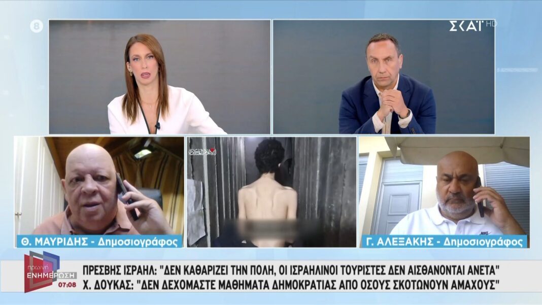 Ο δημοσιογράφος Θανάσης Μαυρίδης και ο συνάδελφός του Γιώργος Αλεξάκης συζητούν στην εκπομπή “Πρωινή Ενημέρωση” για την κατάσταση στη Μέση Ανατολή. Ο Μαυρίδης εκφράζει προβληματισμό για την έλλειψη διαδηλώσεων στην Αθήνα κατά των πράξεων της Χαμάς, ενώ παράλληλα αναφέρεται στη μεταχείριση των ομήρων.