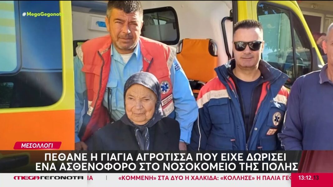 Έφυγε από τη ζωή η ηλικιωμένη γυναίκα που έγινε γνωστή ως η “γιαγιά αγρότισσα” του Μεσολογγίου, αφήνοντας πίσω της σημαντική παρακαταθήκη γενναιοδωρίας. Η εκλιπούσα είχε συγκινήσει την τοπική κοινωνία με την απόφασή της να δωρίσει ένα υπερσύγχρονο ασθενοφόρο στο νοσοκομείο της πόλης, βοηθώντας ουσιαστικά στην αναβάθμιση των υπηρεσιών υγείας της περιοχής.