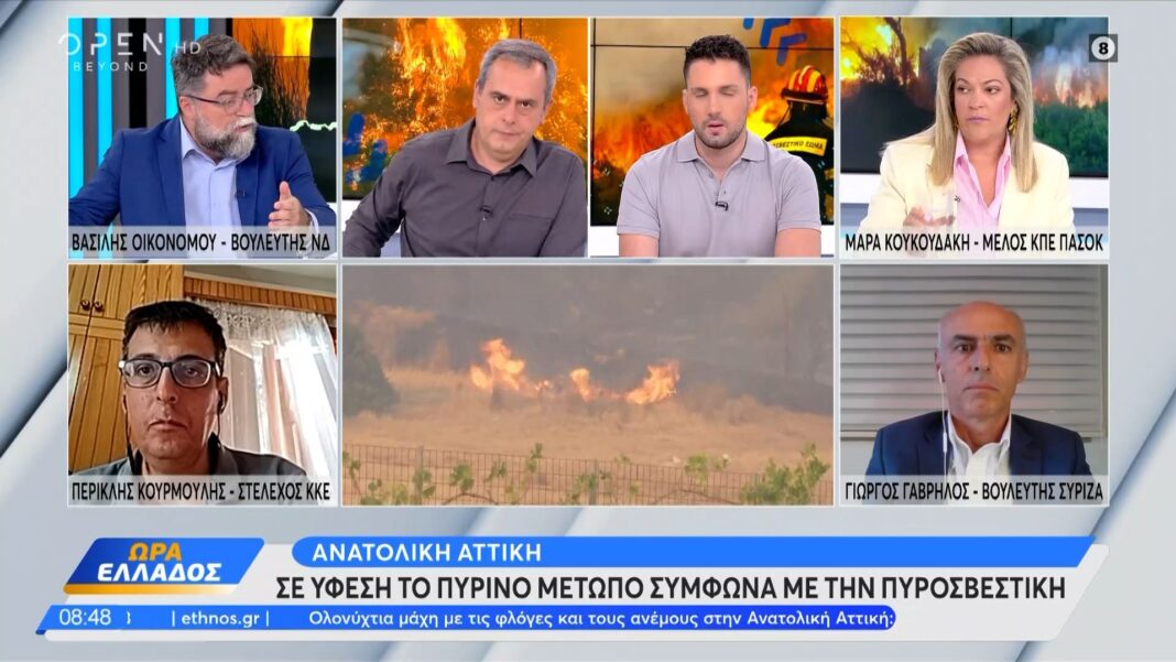 Έντονη αντιπαράθεση σημειώθηκε μεταξύ των εκπροσώπων των κοινοβουλευτικών κομμάτων σχετικά με τη διαχείριση των καμένων περιοχών και την αντιμετώπιση των πυρκαγιών. Ο Βασίλης Οικονόμου από τη ΝΔ υπερασπίστηκε το κυβερνητικό έργο, ενώ οι εκπρόσωποι της αντιπολίτευσης άσκησαν δριμεία κριτική για καθυστερήσεις και ελλείψεις.