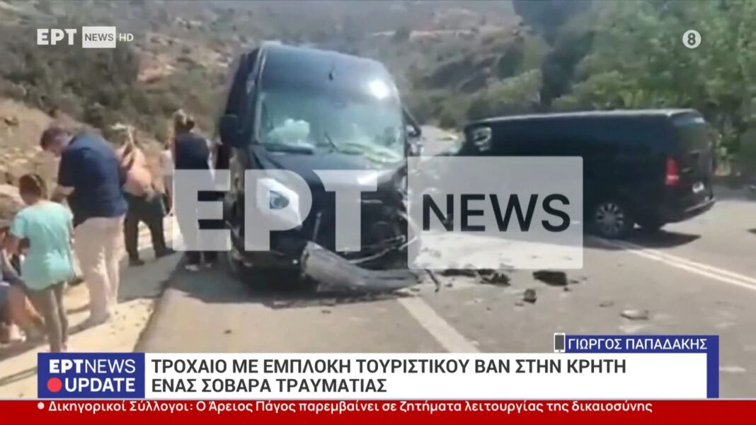 Σοβαρό τροχαίο συνέβη σήμερα το πρωί στην εθνική οδό κοντά στο Ηράκλειο Κρήτης, όταν τουριστικό βαν συγκρούστηκε με διερχόμενο όχημα. Από τη σύγκρουση ένας άνδρας τραυματίστηκε σοβαρά και διακομίστηκε εσπευσμένα στο νοσοκομείο, ενώ άλλοι τέσσερις επιβάτες έχουν ελαφρύτερα τραύματα.