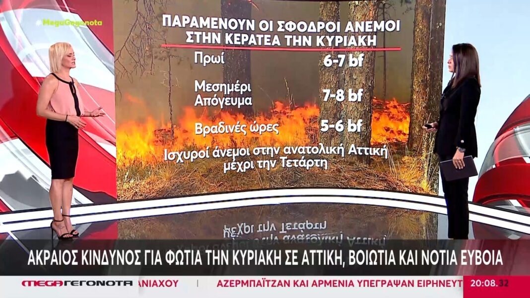 Η Πολιτική Προστασία εξέδωσε έκτακτο δελτίο επικινδυνότητας για εκδήλωση πυρκαγιών την Κυριακή σε Αττική, Βοιωτία και Νότια Εύβοια. Οι ισχυροί άνεμοι που αναμένεται να πνέουν με εντάσεις 7-8 μποφόρ, σε συνδυασμό με τις υψηλές θερμοκρασίες, δημιουργούν εξαιρετικά επικίνδυνες συνθήκες.