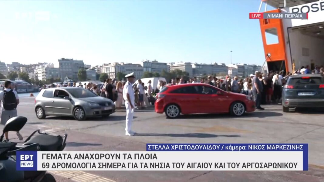 Σήμερα, ο Πειραιάς αντιμετωπίζει αυξημένη κίνηση, καθώς 69 δρομολόγια πλοίων αναχωρούν για τα νησιά του Αιγαίου και του Αργοσαρωνικού. Οι επιβάτες, σε μεγάλο αριθμό, εκμεταλλεύονται τις θερινές διακοπές για να αποδράσουν από την πόλη, γεμίζοντας τα πλοία.