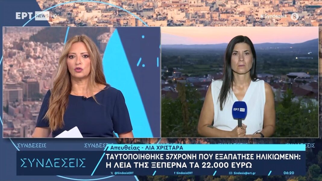 Ταυτοποιήθηκε 57χρονη γυναίκα, η οποία φέρεται να εξαπάτησε μια ηλικιωμένη, αποσπώντας της πάνω από 22.000 ευρώ. Η δράστις χρησιμοποίησε διάφορες μεθόδους πειθούς για να πείσει το θύμα να της παραδώσει τα χρήματα, εκμεταλλευόμενη την εμπιστοσύνη της.
