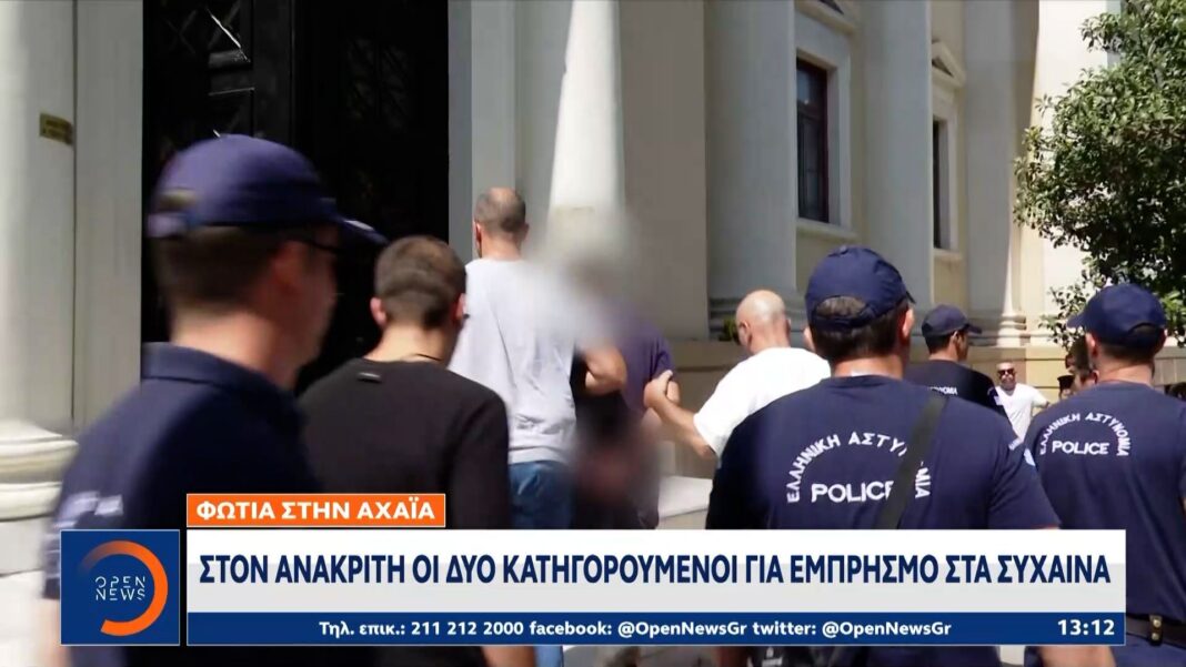 Δύο άνδρες, ηλικίας 19 και 27 ετών, βρίσκονται ενώπιον του ανακριτή με σοβαρές κατηγορίες για εμπρησμό στα Συχαινά Αχαΐας. Ο 19χρονος έχει ομολογήσει την πράξη του, ενώ ο 27χρονος ισχυρίζεται ότι δεν θυμάται λόγω κατανάλωσης αλκοόλ.