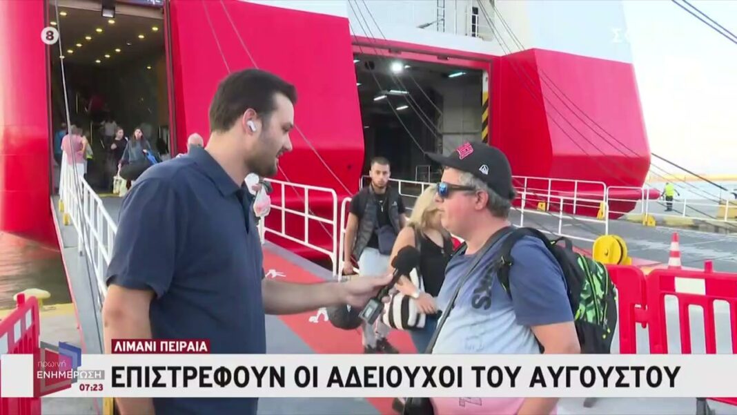 Στο λιμάνι του Πειραιά, χιλιάδες αδειούχοι επιστρέφουν από τις καλοκαιρινές διακοπές τους, με αποτέλεσμα να παρατηρείται αυξημένη κίνηση. Οι επιβάτες αναμένεται να προσεγγίσουν τα πλοία για τις προγραμματισμένες αναχωρήσεις, ενώ οι υπηρεσίες του λιμανιού έχουν προετοιμαστεί για την υποδοχή τους.